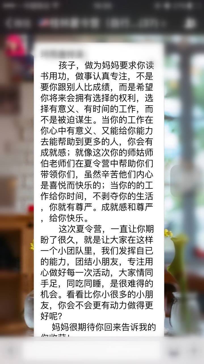 晚上我们提醒孩子们可以给父母写一封信。我们读着其中的很多篇就已经被孩子稚嫩而纯真的语言打动。于是,我们意识到,请父母给孩子们也写一封信告诉孩子们父母此时的心情和期待是多么的必要。